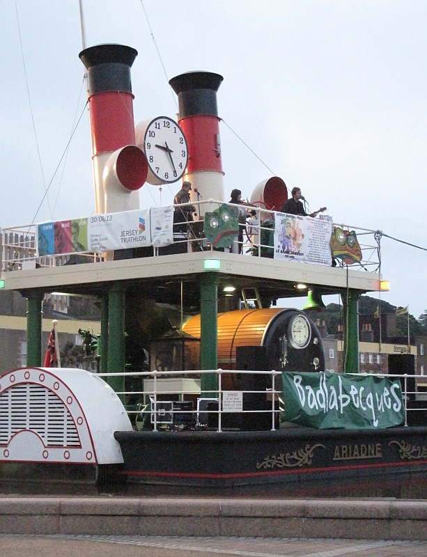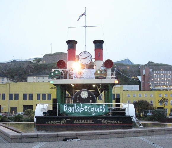 Yesterday evening Badlabecques performed atop the steam clock Ariadne in Saint Helier for La Fête de la Musique 2013.