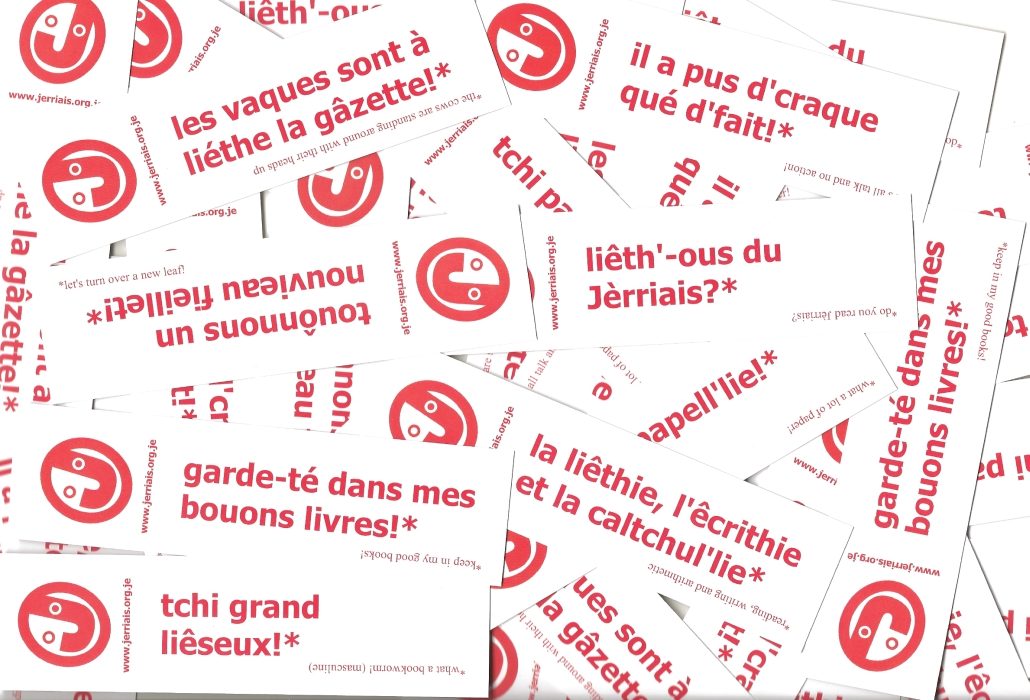 Hot off the press: new bookmarks with a range of reading/paper-related slogans in Jèrriais.
